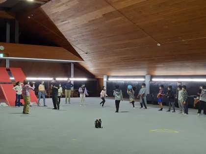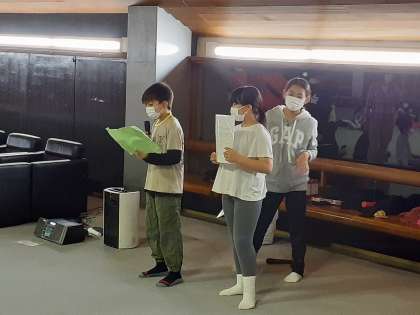 キャンプファイヤーのレクリエーションは屋内に場所を移し、キャンプファイヤー係の子どもたちによる司会進行で「ドラえもん音頭」やゲームを楽しみました。