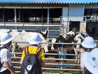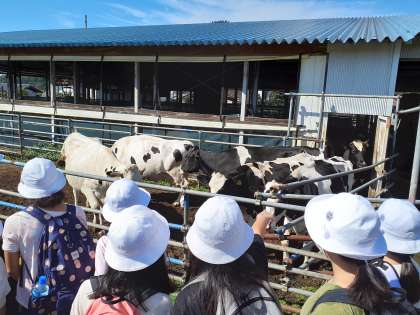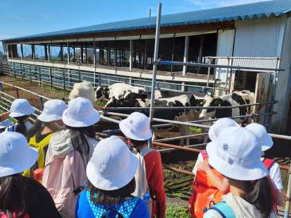 牛舎の前を通りかかり、子どもたちは牛との対面に感激していました。