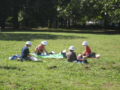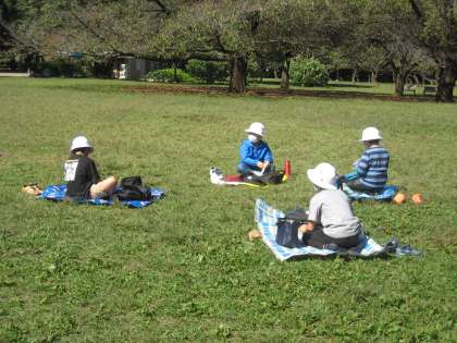 砧公園にて昼食をとりました。子どもたちは、芝生の上でお弁当をひろげ、おいしそうに頬張っていました。