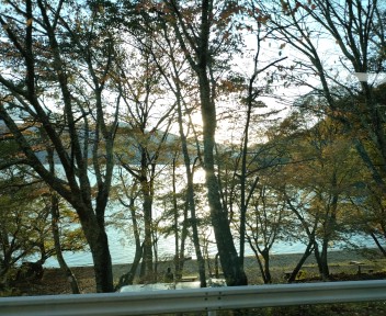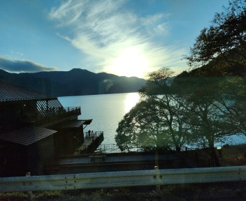 宿舎までの帰路、渋滞中。中禅寺湖に沈む夕日が眩しい夕方です。