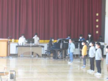 最初に音楽委員の児童の伴奏による全校合唱「僕の夢は君の夢」を全校児童が歌いました。今回は保護者の方への動画配信と併せて全学年の教室にも配信しているので、3年生以外は各教室で歌いました。