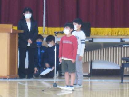 2年生の合唱曲は「赤いやねの家」「ユメタマゴ」。代表児童が挨拶してから皆で気持ちを合わせて元気な声を響かせました。全学年の教室にも動画配信しているので、他学年は各教室で視聴しました。
