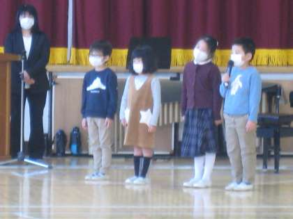 1年生の合唱曲は「すてきな一歩」「世界がひとつになるまで」。代表児童が挨拶してから皆で元気な声を響かせました。初めての合唱発表会でしたが、手話を交える工夫などをして元気に歌いました。全学年の教室にも動画配信しているので、他学年は各教室で視聴しました。