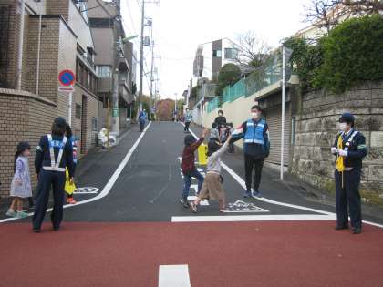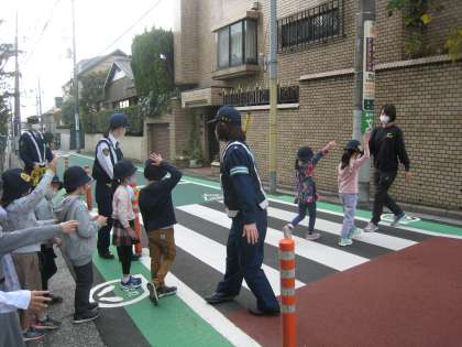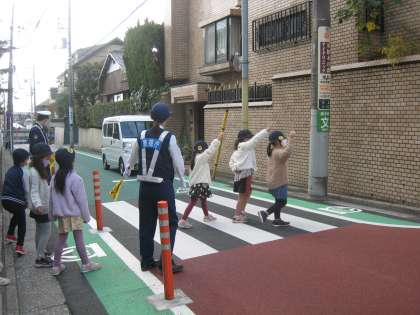 11月16日、PTA校外委員の皆さんが企画した交通安全教室を実施しました。北沢警察の警察官の方に安全な横断歩道の渡り方などについて安全指導を受け、実際に西門前の横断歩道を渡り、羽根木公園へ向かう坂道で練習しました。