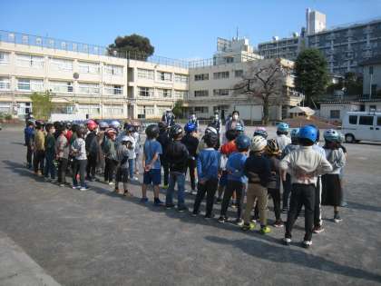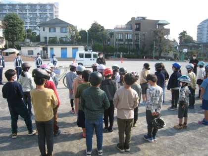 11月16日、PTA校外委員の皆さんが企画した交通安全教室を実施しました。子どもたちは、自転車業者の方から自転車整備の大切さを説明していただき、北沢警察の警察官の方に安全な自転車の乗り方についてお話をうかがいました。その後、実際に自転車に乗りながら安全指導を受け、交通安全についての認識を高めました。
