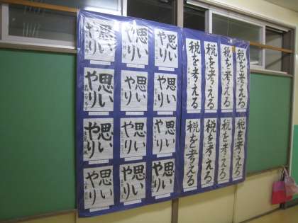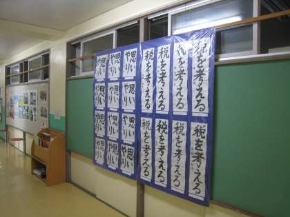 国税庁主催による「税を考える週間」行事の一環として実施されています「小学生書道作品展」に出品しました児童作品が返却されました。展示を予定していた会場が、新型コロナウイルスワクチン接種会場となり残念ながら作品展は開催されませんでした。校内では力作揃いの書道作品を図書室前の壁面にしばらく展示します。