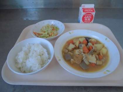 麦ごはん いりどり煮 ツナと野菜のあえもの 牛乳