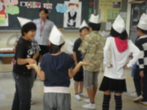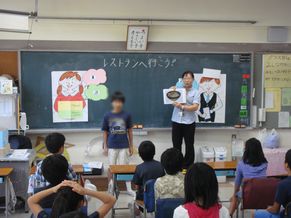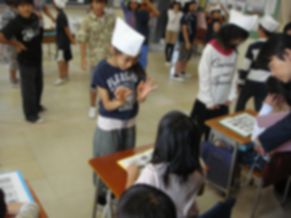 この間は6年生が研究授業だったけど、今度は私たち4年生。「レストランへ行こう!」という活動です。まずは友達の発音を聞きながら英語でメニューの確認。いよいよ本番。”Can I order now ?”と聞かれたら、コック帽をかぶって元気よく"Sure !"。" Here you are. " "Thank you. "と、楽しくやり取りができました。