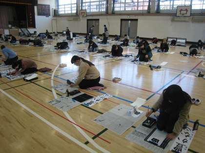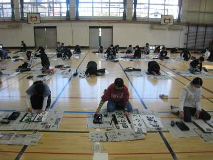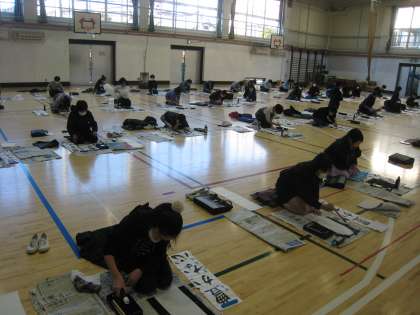 1月14日、5年生は席書会で書初めに取り組みました。お題は「豊かな心」子どもたちは、新年の思いを込めて厳かな雰囲気の中で集中して筆を走らせました。