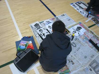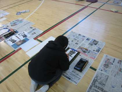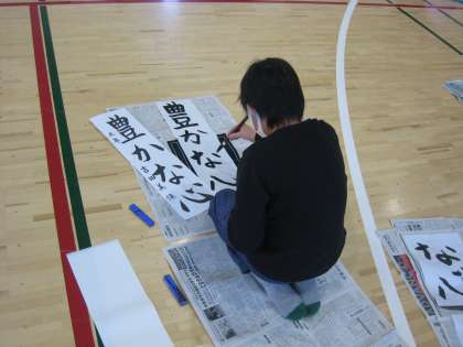1月14日、5年生は席書会で書初めに取り組みました。お題は「豊かな心」子どもたちは、新年の思いを込めて厳かな雰囲気の中で集中して筆を走らせました。