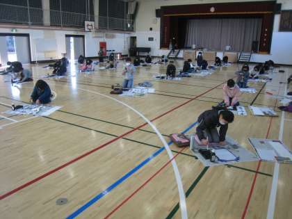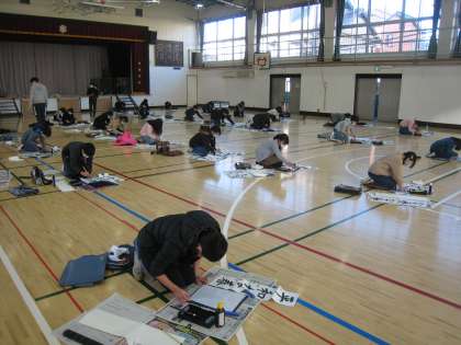 1月14日、6年生は小学校生活最後の席書会で書初めに取り組みました。お題は「平和な春」子どもたちは、新年の思いを込めて厳かな雰囲気の中で集中して筆を走らせました。