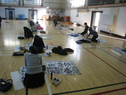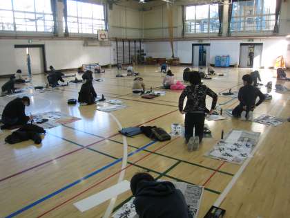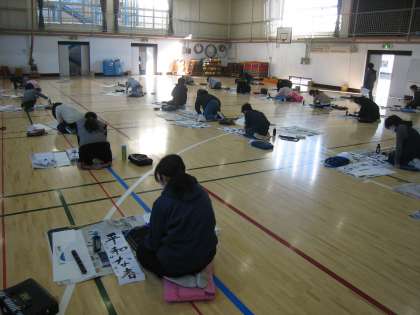 1月14日、6年生は小学校生活最後の席書会で書初めに取り組みました。お題は「平和な春」子どもたちは、新年の思いを込めて厳かな雰囲気の中で集中して筆を走らせました。