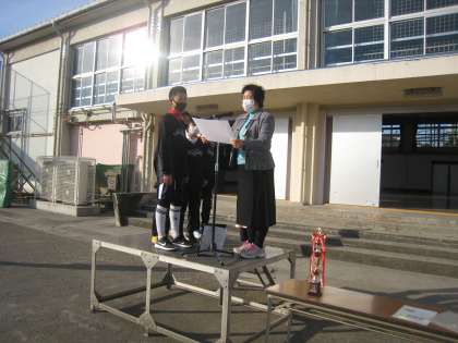 1月17日、全校朝会で児童の表彰がありました。4年生が「第69回 東京都統計グラフコンクール」に「かってる?かいたい?どんなペット?!」というポスターを応募して入選しました。5・6年生の4名の所属しているサッカーチームが世田谷区主催の「小学校スポーツ教室サッカー大会」に出場して優勝しました。
