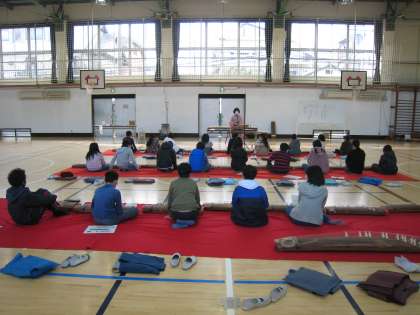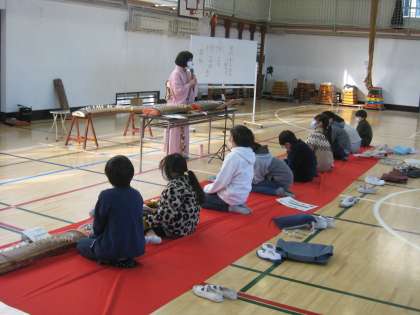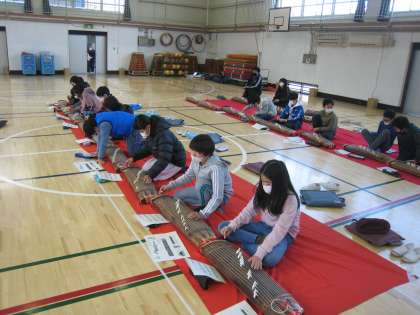 1月20日、5年生対象に筝体験教室を行いました。筝は1400年ほど前に雅楽の合奏楽器の一種として日本に入ってきました。子どもたちは演奏用の爪を付け、筝のゲストティーチャーから基本的な姿勢や演奏の仕方を教えていただき、「さくらさくら」を習い、合奏を行いました。体育館に日本古来の調べが美しく響き渡り、伝統文化のよさを感じる時間が過ごせました。