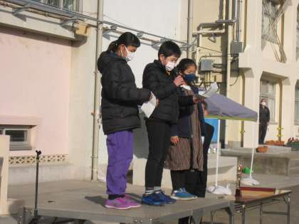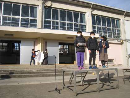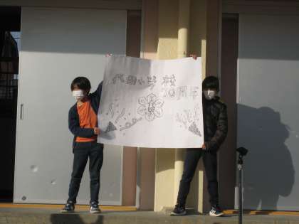 1月24日、全校朝会で代表委員会の児童から「開校70周年記念Tシャツ」のデザイン原画の発表がありました。100点を超える応募作品の中から皆の投票により選ばれたのは、4年児童の作品でした。その作品を元にしてTシャツのデザインを製作中です。決定したらお知らせします。