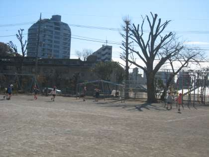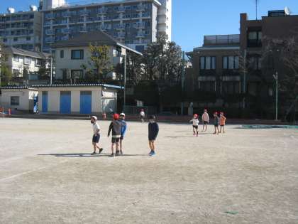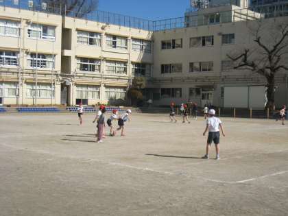 中休みには1〜3年生が校庭遊びをします。子どもたちは寒空の下、追いかけっこ、ブランコ、ドッジボールなど思い思いの遊びをしながら元気よく動き回っています。