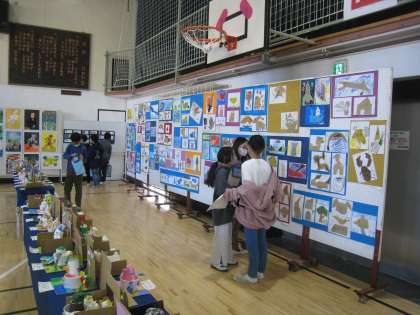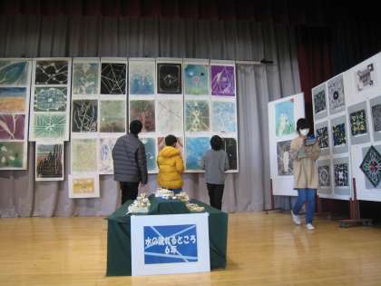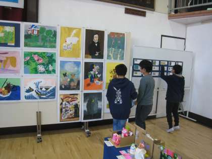 2月17日、5年生の児童鑑賞時間。作品の感想を書くために探検ボードを片手に持ちながら自分の作品や他学年の児童作品を熱心に鑑賞していました。