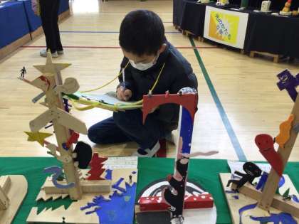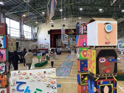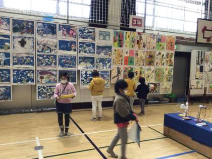 2月17日、3年生の児童鑑賞時間。作品の感想を書くために探検ボードを片手に持ちながら自分の作品や他学年の児童作品を熱心に鑑賞していました。