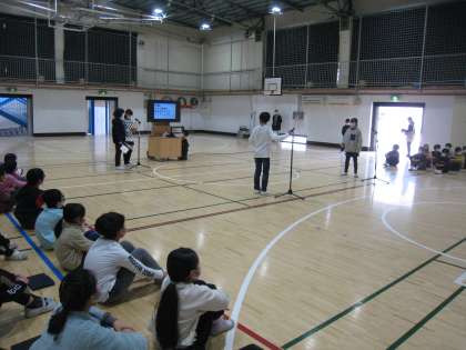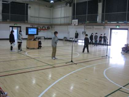 4年生は「6年生にチャレンジ」という企画、クイズ、ダジャレ、物まね…様々なジャンルで4年生の代表児童が6年生に挑戦し、競いました。結構、白熱した展開でしたが6年生の知識や技量は手強かったです。