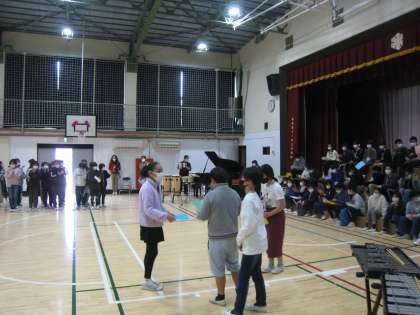 5年生は6年間の軌跡を演劇仕立てにしたビデオ作品を製作し、上映しました。最後は、縦割り班の1〜5年生が心を込めて書いた寄せ書きを6年生一人一人に渡しました。皆、気持ちが込められたメッセージカードを感慨深く読んでいました。