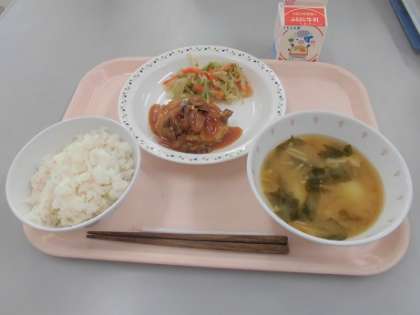 麦ごはん 豆腐入りハンバーグ こんにゃくサラダ みそ汁 牛乳