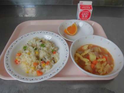 アスパラ入りピラフ ミネストローネスープ くだもの(清見オレンジ) 牛乳