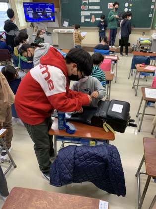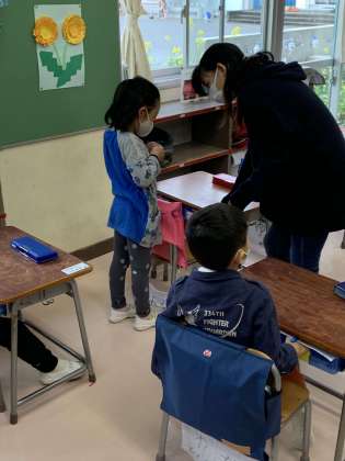 登校して、ランドセルから教科書を出して引き出しに入れたり、名札をつけたりすることのお手伝いをしています。
