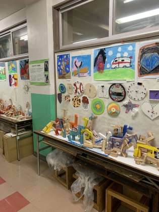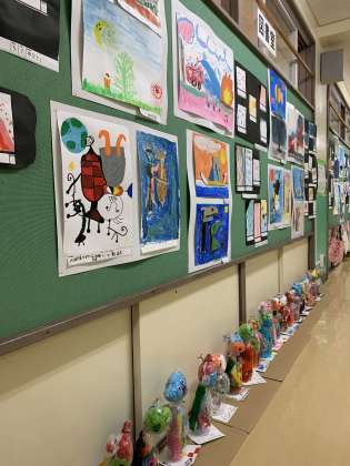 図工室の前はもちろん、図書室の前や昇降口も様々な図工作品が展示されています。