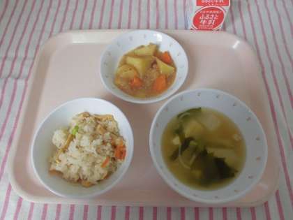 子ぎつねごはん じゃがいものそぼろ煮 冬瓜入りスープ 牛乳