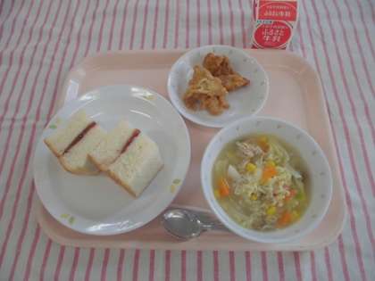 ジャムサンド 鶏肉のから揚げ ABCスープ 牛乳