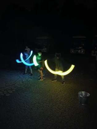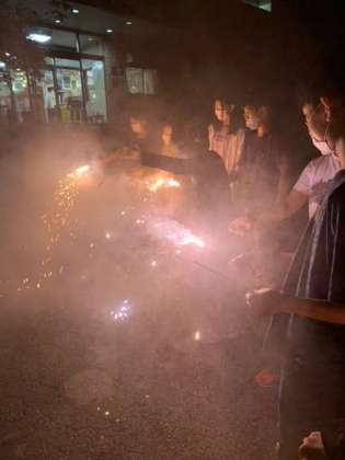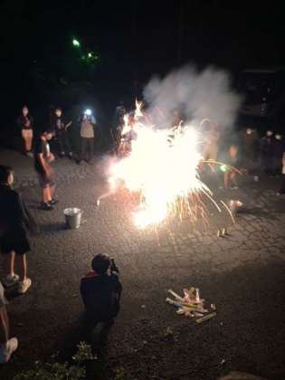 みんなで手持ち花火を楽しんだ後、花火係の有志3名のダンス、フィナーレは、吹き出し花火をみんなで見て、線香花火でしみじみしました。