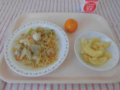 五目あんかけそば フライドポテト くだもの(冷凍みかん)牛乳