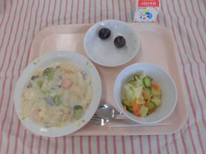 キャロットライスクリームソースかけ フレンチサラダ くだもの(ピオーネ)牛乳