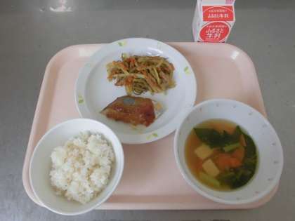 麦ごはん 魚の西京焼き 刻みこんぶの五目煮 よしの汁 牛乳