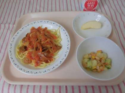 スパゲティ地中海ソース ビーンズサラダ くだもの(りんご)牛乳