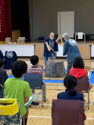 三土代会は、江戸時代から続く餅つきを伝承する会です。子どもたちは、興味深くお話を聞いていました。