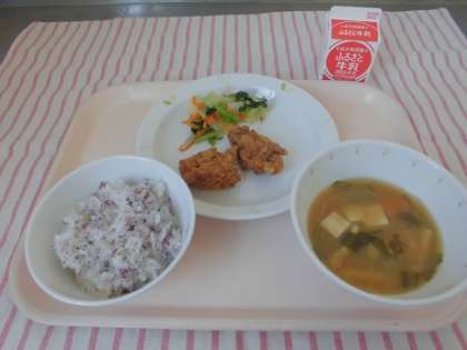 ゆかりごはん とりにくのから揚げ 野菜のおかかかけ みそ汁 牛乳