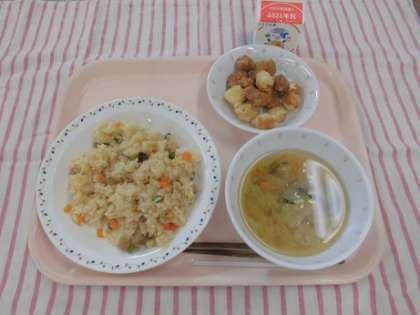 中華おこわ 魚と高野豆腐のから揚げ 白菜スープ 牛乳