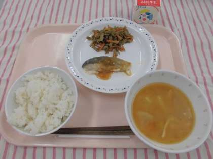麦ごはん 魚の梅肉焼き きんぴらごぼう 呉汁 牛乳