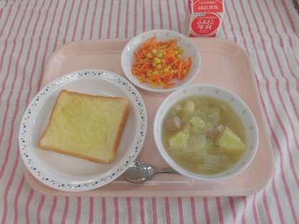 ガーリックトースト ポトフ にんじんサラダ 牛乳