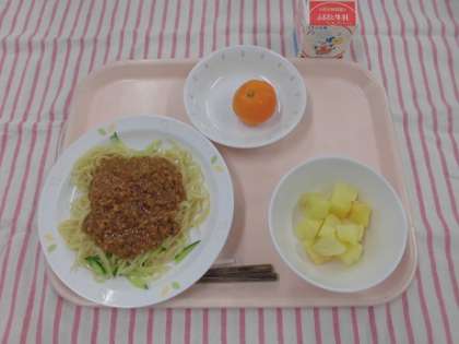ジャージャー麺 ベイクドポテト くだもの(冷凍みかん)牛乳