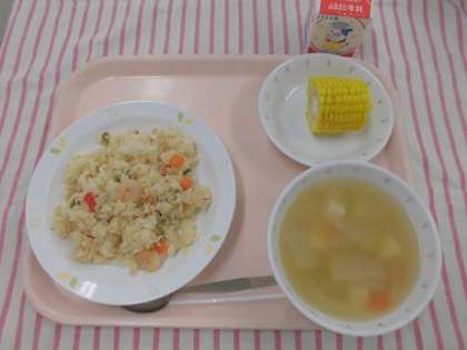 <インドネシア料理> ナシゴレン 蒸しとうもろこし 冬瓜スープ 牛乳