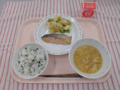 3年2組 リクエスト献立 わかめごはん 鮭の照り焼き 即席漬 かきたま汁 牛乳