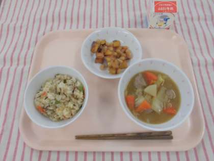 <節分献立> 磯おこわ いわしのつみれ汁 おまめかりんとう 牛乳