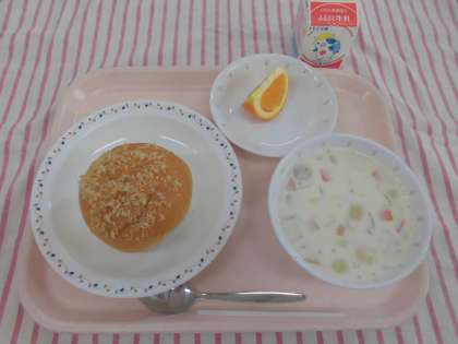 焼きカレーパン つぶつぶコーンと豆のポタージュ くだもの(清見オレンジ) 牛乳