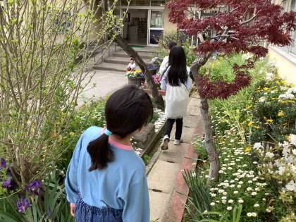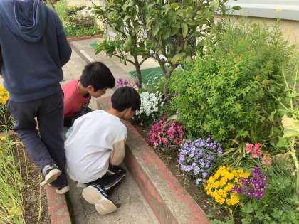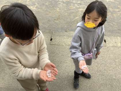 校庭では4年生が春さがしをしていました。「お花がいっぱい咲いていて、春っぽいね」「ありが何か運んでる」それぞれが見付けた春を口々につぶやいていました。