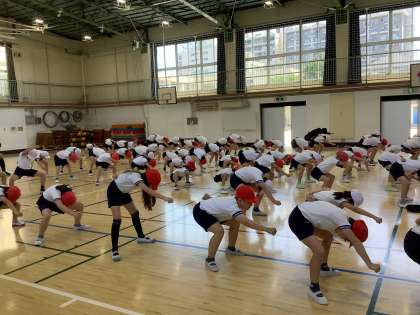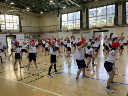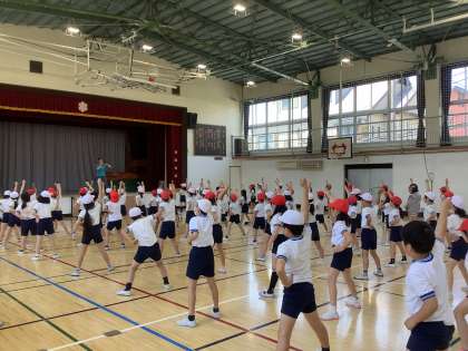 体育館から元気な掛け声が聞こえてきました。足をむけてみると、運動会の練習を行なっていました。今年の表現種目にやる気満々の子どもたち。先生の指示を聞きながら、元気な掛け声と共に、思いっきり体を動かしていました。これからが楽しみです。