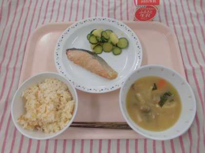 あけぼのごはん 魚の照り焼き 新じゃがのみそあえ 呉汁 牛乳