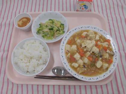 麦ごはん 西湖豆腐 中華サラダ 黒糖寒天 牛乳