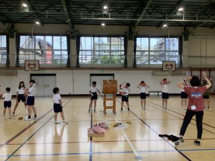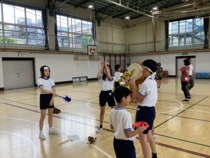 中休みの体育館では、応援団が練習をしています。太鼓の音に合わせて、大きな振り付け、元気な姿と大きな声で全校のみんなを引っ張ります。